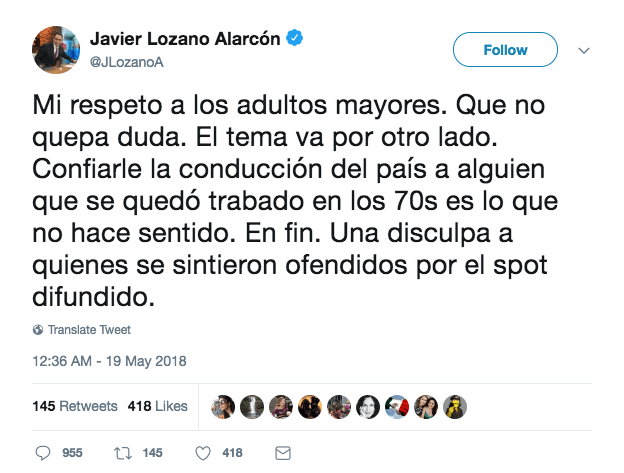 El clip mostraba de espaldas a un hombre de pelo canoso parecido a López Obrador sentado en el asiento del conductor de un vehículo e insistiendo en que quiere manejar mientras su hija le dice que ya no puede hacerlo. [video width="640" height="360" mp4="https://gobiznext.com/wp-content/uploads/2018/05/Javier-Lozano-del-PRI-difunde-Video-contra-AMLO-No-lo-dejes-manejar-por-su-avanzada-edad.mp4"][/video] En el video se lee: "Si alguien ya no está en condiciones, quiérelo y respétalo, pero no lo dejes manejar un país". Ante las críticas que recibió, el vocero de la campaña de José Antonio Meade borró el material y se disculpó en otro tuit:
