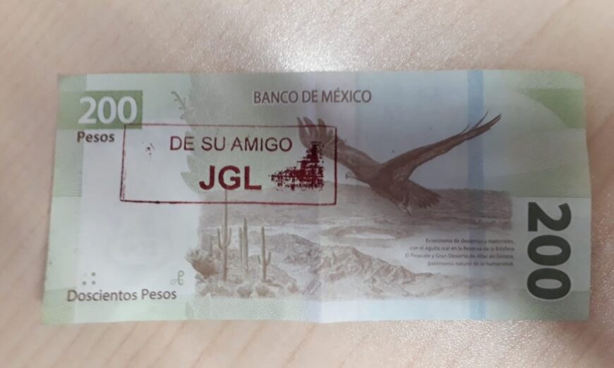 De acuerdo con Riodoce, en Culiacán han circulado billetes de 200 pesos con la leyenda impresa “DE SU AMIGO JGL”, que son las iniciales de Joaquín Guzmán Loera.