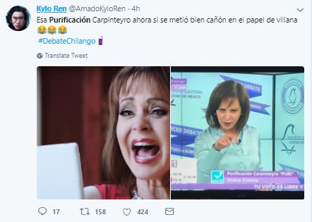 En su primera participación en el debate, la candidata de Nueva Alianza informó que presentó una denuncia ante el INE porque, dijo, no había tenido una cobertura equitativa en los medios. Su mirada seria y su forma de interpelar a otros candidatos de nuevo desataron las comparaciones entre Carpinteyro y las villanas de las telenovelas.