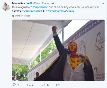 El candidato que muchos recuerdan por recitar un poema al cierre del primer debate llegó con algunas puntadas bastante extrañas bajo la manga. Primero arribó disfrazado como su personaje 'Superbarrio' y usó su cuenta de Twitter para agradecerle a su 'alter ego' por estar ahí.