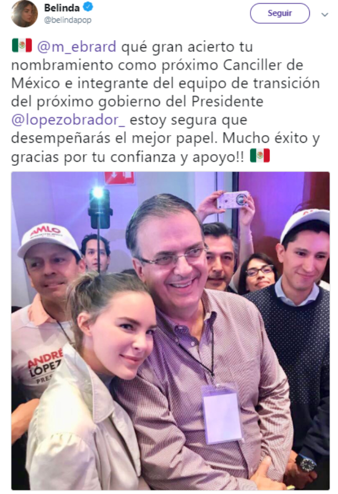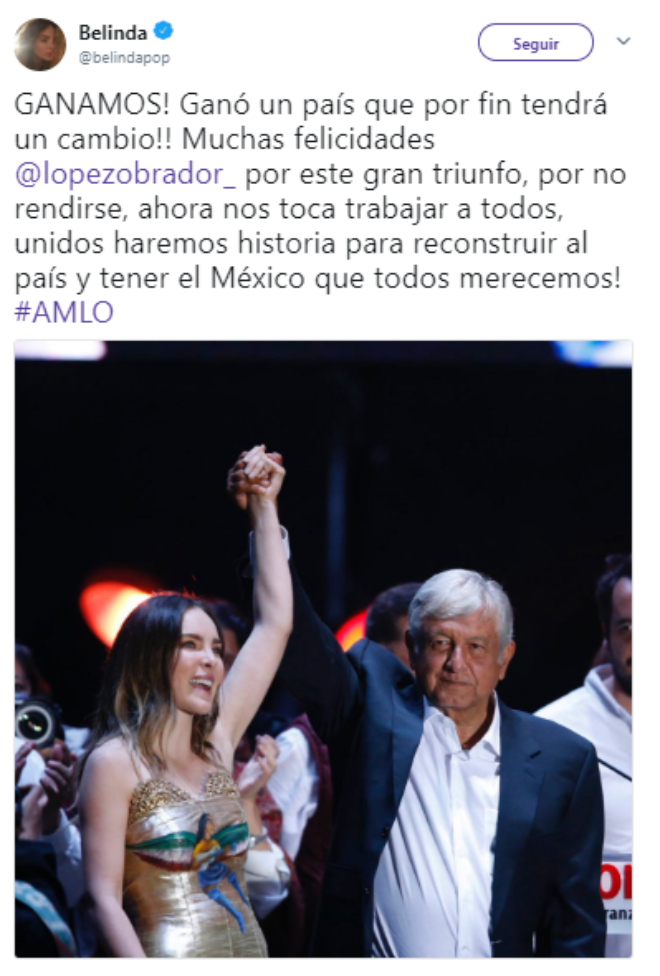 Luego de que este domingo AMLO se convirtiera en el virtual ganador de las elecciones en el país, se hizo presente en el Zócalo para dar un discurso, mismo en el que Belinda estuvo presente…
