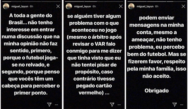 “Si alguien tiene algún problema con lo que ocurrió en el juego (incluso el árbitro después de revisar el VAR habló conmigo para decirme que había visto que no intenté pisar a propósito, de lo contrario habría sacado la tarjeta roja) pueden enviar mensajes en mi cuenta, incluso amenazar, no tengo problema, sé que son cosas del futbol. Pero quiero pedirles por favor, respeto por mi familia, eso no lo acepto. Gracias”.
