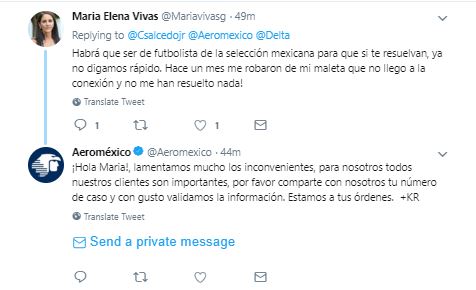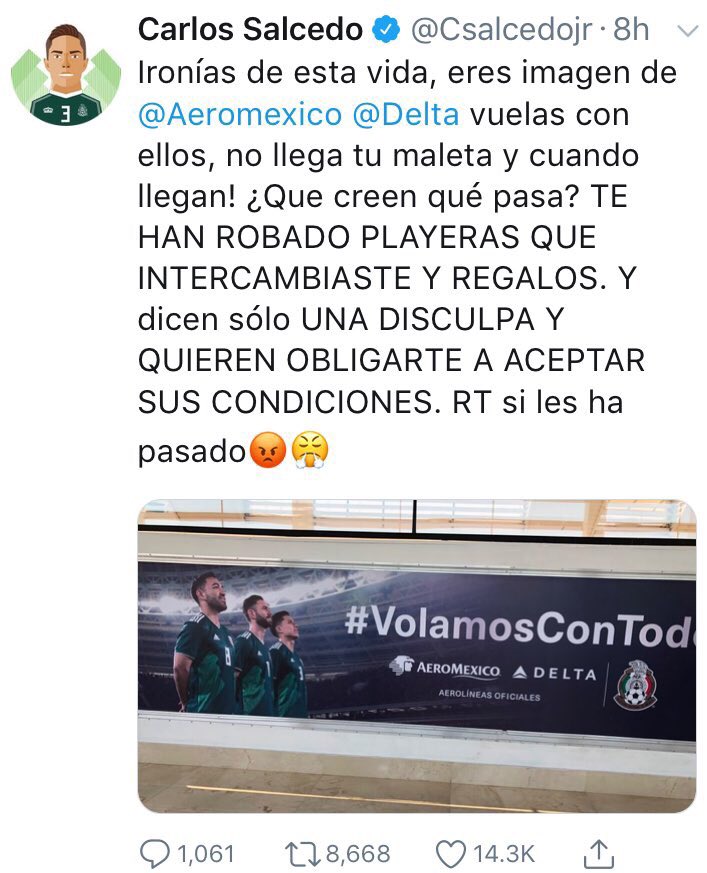Y usó su cuenta de Twitter para externar su molestia: "Ironías de esta vida, eres imagen de @Aeromexico @Delta, vuelas con ellos, no llega tu maleta y cuando llegan, ¿qué creen que pasa? TE HAN ROBADO PLAYERAS QUE INTERCAMBIASTE Y REGALOS. Y dicen sólo UNA DISCULPA Y QUIEREN OBLIGARTE A ACEPTAR SUS CONDICIONES".