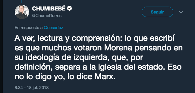 Será muy izquierda, pero escribe con la derecha, amix. — CHUMIBEBÉ (@ChumelTorres) July 18, 2018
