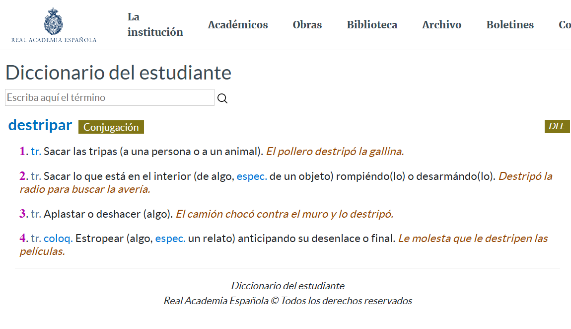 De acuerdo con la Real Academia Española (RAE), "destripe" es un sustantivo masculino que significa la revelación de la trama de una obra, como un libro o una película, especialmente si es no deseada. "Destripe" proviene del verbo "destripar", que tiene varios significados:- Sacar las tripas de una persona o animal.