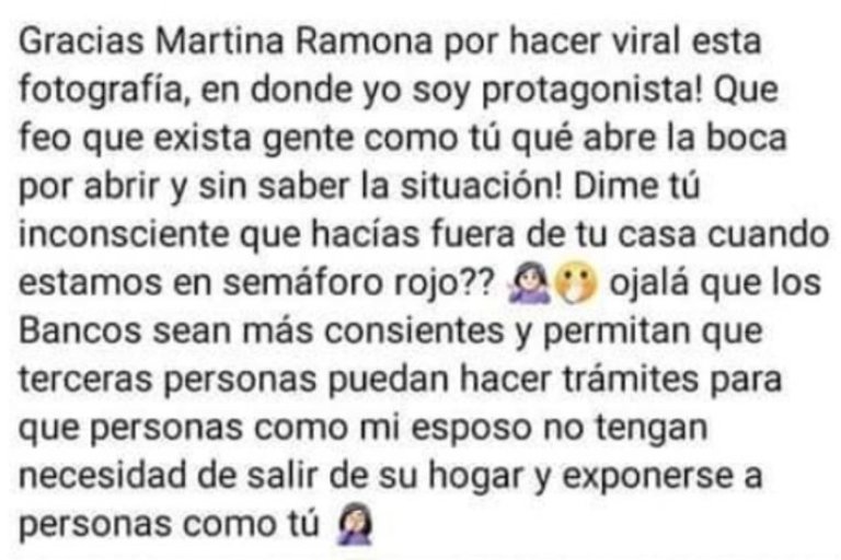 Tras viralizarse la foto, una mujer llamada Helen afirmó que son ella y su esposo quienes aparecen en la foto y habían salido porque necesitaban hacer un trámite en el banco.“Qué feo que exista gente como tú, que abre la boca sin saber la situación. ¿Dime tú inconsciente qué haces tú afuera de tu casa en semáforo rojo?”, escribió la mujer.