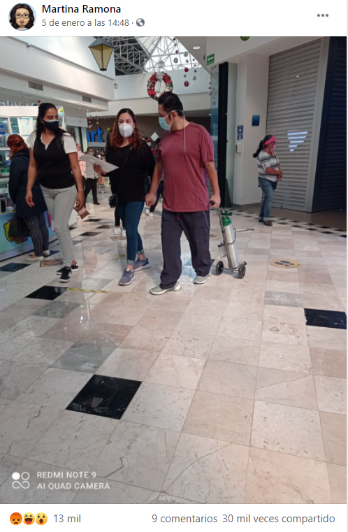 En la imagen que ha sido compartida más de 30 mil veces, se observa a un hombre caminando con dos mujeres, mientras arrastra su tanque de oxígeno.