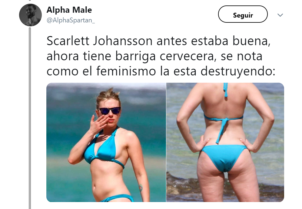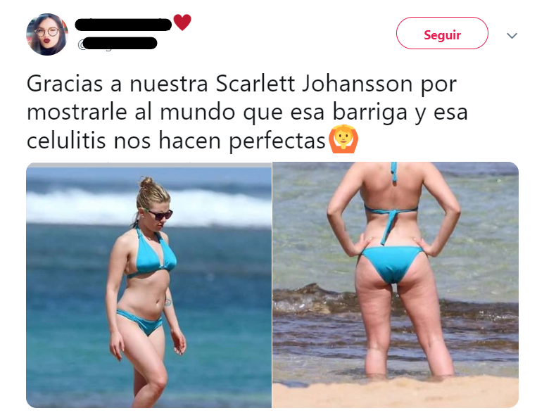 "Gracias a nuestra Scarlett Johansson por mostrarle al mundo que esa barriga y esa celulitis nos hacen perfectas", escribió una usuaria.