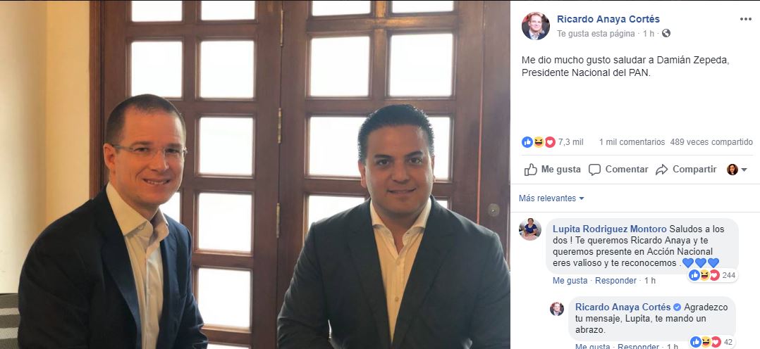 "Me dio mucho gusto saludar a Damián Zepeda, Presidente Nacional del PAN", escribió Anaya junto a la fotografía que ya suma más de 7,300 reacciones.