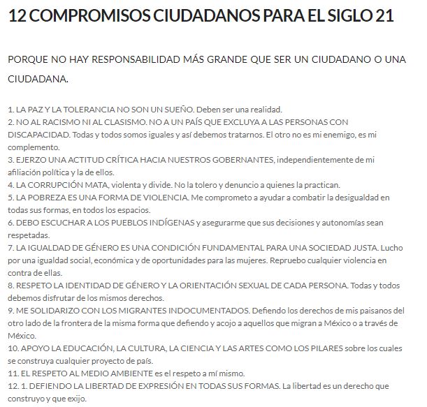 También incluye un manifiesto con 12 compromisos ciudadanos para buscar un mejor país.