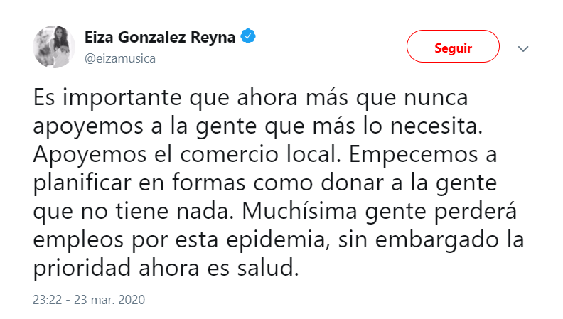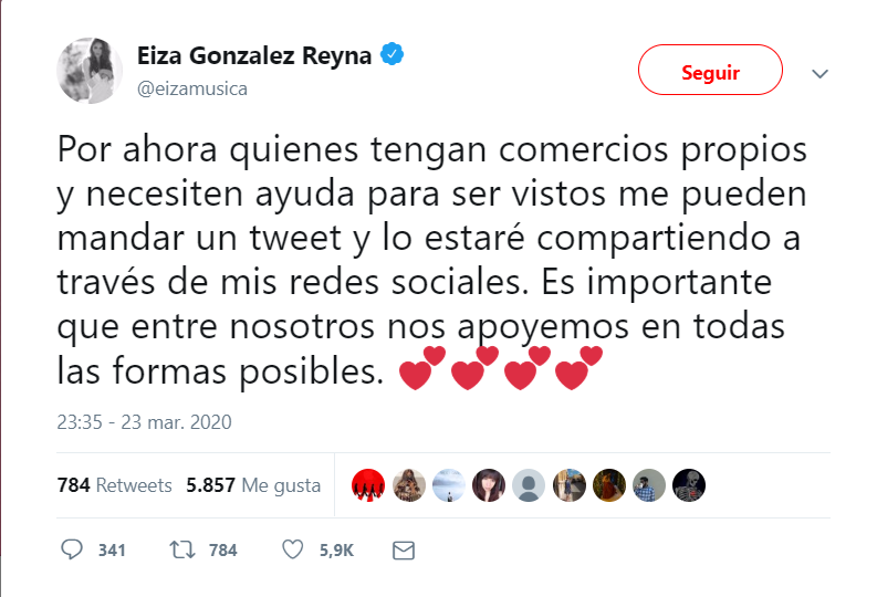 "Por ahora quienes tengan comercios propios y necesiten ayuda para ser vistos me pueden mandar un tweet y lo estaré compartiendo a través de mis redes sociales. Es importante que entre nosotros nos apoyemos en todas las formas posibles", escribió Eiza en su cuenta de Twitter.
