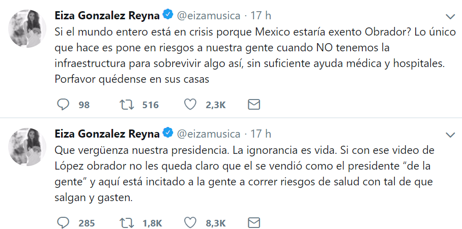 "Si el mundo entero está en crisis porque Mexico estaría exento Obrador? Lo único que hace es pone en riesgos a nuestra gente cuando NO tenemos la infraestructura para sobrevivir algo así, sin suficiente ayuda médica y hospitales. Por favor quédense en sus casas", afirmó Eiza.