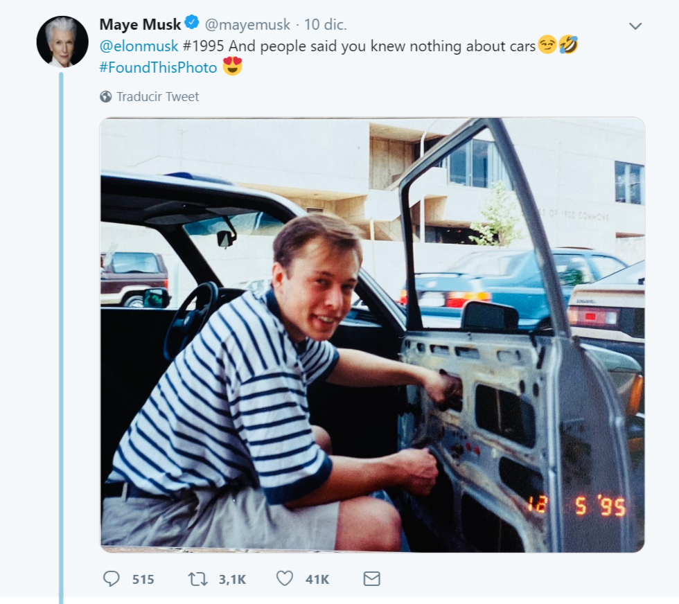 "#1995 Y la gente decía que no sabías nada de autos", escribió Maye junto a una fotografía donde aparece Elon.