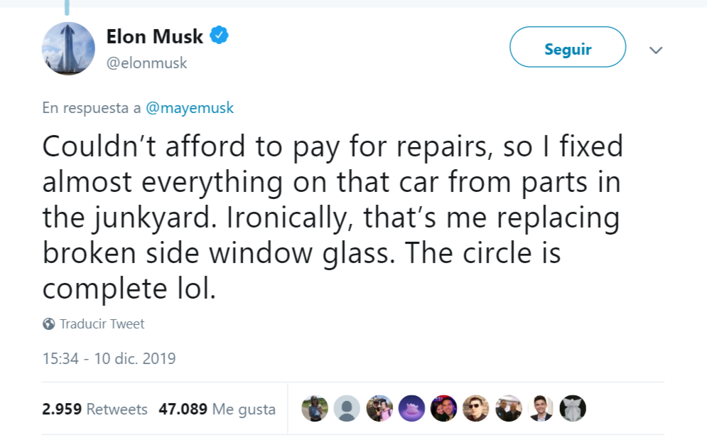 Elon no tardó en responder a la fotografía y recordó que en ese entonces no tenía para pagar las reparaciones de su auto por lo que lo hacía él mismo.