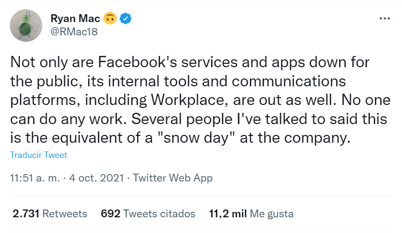 informó que las herramientas de comunicación interna que usan los empleados de Facebook como la aplicación Workplace, también quedaron inactivas y no pueden trabajar.