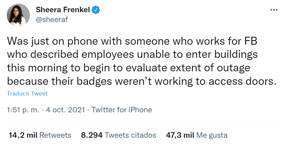 De acuerdo con reportera de tecnología de The New York Times, Sheera Frenkel, una fuente de Facebook le dijo que los empleados no pudieron ingresar a los edificios de la empresa porque no funcionaban sus tarjetas de acceso.