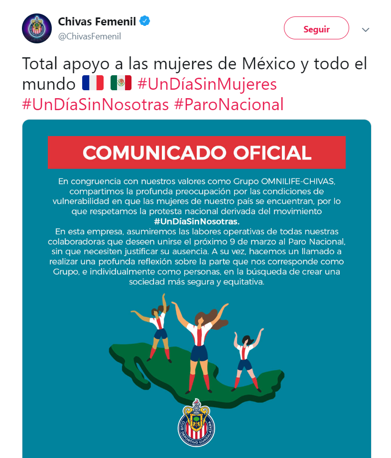 Grupo Omnilife Chivas manifestó su apoyo a las mujeres que deseen sumarse al paro y no tendrán que justificar su falta.
