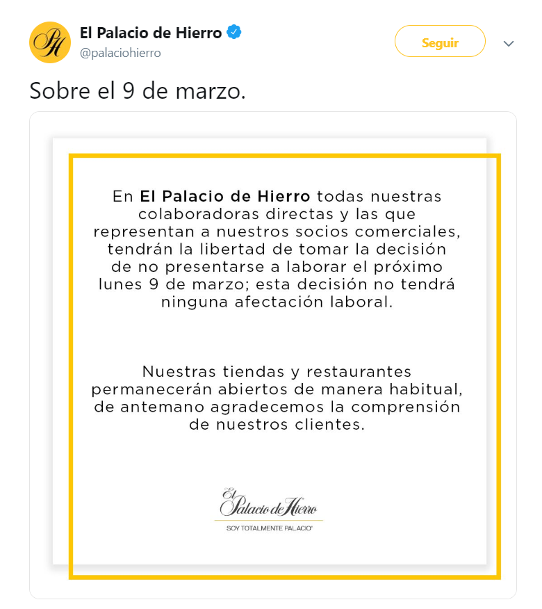Palacio de Hierro señaló que sus colaboradoras tendrán la libertad de sumarse al paro sin que haya consecuencias.