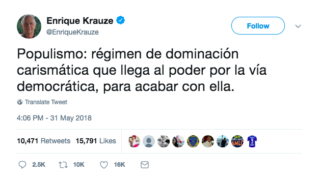 Todo empezó cuando el historiador, Enrique Krauze, escribió en su cuenta de twitter esta definición de populismo: