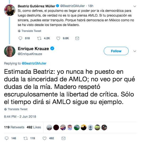 Krauze contestó a la maestra en letras con este tuit: