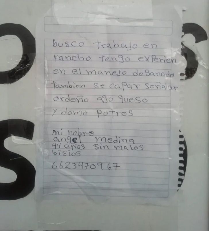 “Busco trabajo en rancho, tengo experiencia en el manejo de ganado, también sé capar, ordeñar, hago queso y domo potros. Mi nombre es Ángel Medina, de 44 años, sin malos vicios” decía su curriculum.