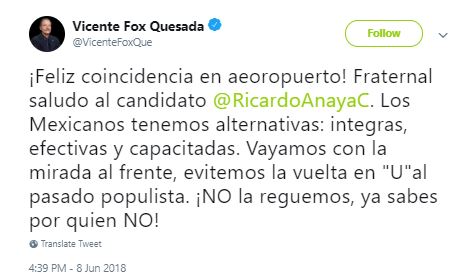 El caluroso recibimiento del expresidente a Anaya extrañó a varios porque anteriormente, Fox había externado su apoyo a Meade, pero en una entrevista reciente, el exmandatario manifestó que respalda a ambos.
