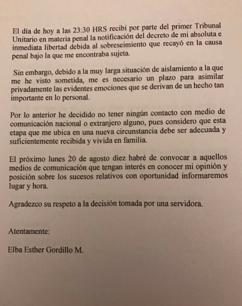 Fue a las 23:30 horas que se dio la notificación de que se ordenaba la inmediata libertad de la ex líderesa del SNTE. Tras un litigio que ha durado más de 5 años, su abogado, Marco Antonio del Toro dio a conocer que ya es oficial; un Tribunal Federal canceló el proceso penal contra la maestra.