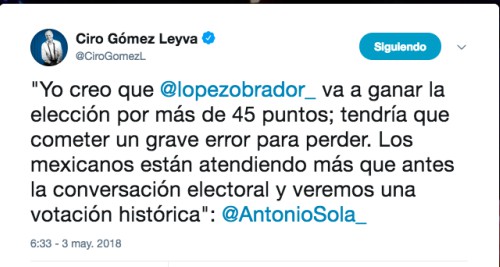 “López Obrador ha mantenido su posición antisistema pero ha moderado su discurso en algunas partes, acercándolo a otro electorado. Además, compite contra malos candidatos”, indicó Antonio Solá en el noticiario de Ciro Gómez Leyva.