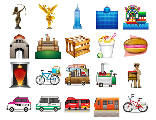 Otras propuestas incluyeron medios de transporte como el Metro, Metrobús y microbús, el Monumento a la Revolución, Bellas Artes, personajes como El Santo y Frida Kahlo y antojitos como el elote con mayonesa y tacos al pastor. Los emojis de la CDMX podrán descargarse a partir de septiembre.
