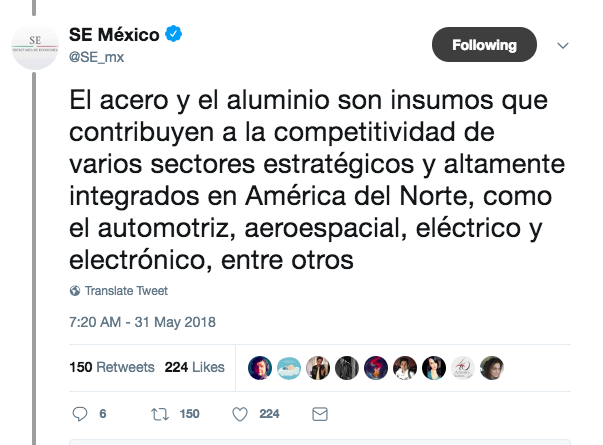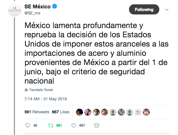 Esta mañana el secretario de Comercio estadounidense, Wilbur Ross, aseveró que se impondrán aranceles a México Canadá y la Unión Europea de 25% para el acero y de 10% para el aluminio. Dichas medidas entrarán en vigor a partir del primero de junio, es decir, hoy a media noche.