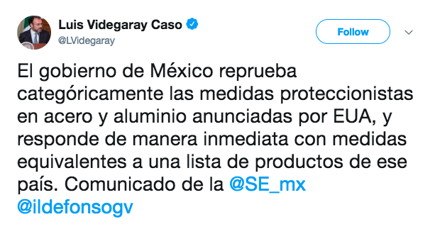 En respuesta, la Secretaría de Economía informó en un comunicado y en su cuenta de Twitter que en contramedida impondrá aranceles a diversos productos estadounidenses como aceros planos, lámparas, piernas y paletas de puerco, embutidos y preparaciones alimenticias, manzanas, uvas, arándano, diversos quesos, entre otros, hasta por un monto equiparable al nivel de la afectación.