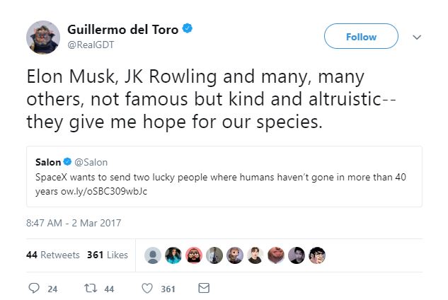 ¿Qué tal? Del Toro ya había manifestado su admiración por Musk a través de Twitter en el pasado, diciendo: "Elon Musk, JK Rowling y muchos otros no famosos, pero gentiles y altruistas, me hacen sentir esperanza por nuestra especie.