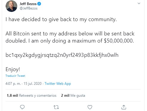 “He decidido devolver a mi comunidad. Todo el dinero que se envíe a mi dirección será devuelto al doble. Sólo estoy haciendo un máximo de USD 50.000.000″, decía un tuit en el perfil oficial de Jeff Bezos e incluía un código para hacer la transferencia.