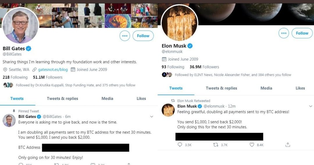 Las cuentas de Twitter de personalidades como: Elon Musk, Bill Gates, Kanye West, Jeff Bezos, Joe Biden, Barack Obama y Michael Bloomberg fueron hackeadas este miércoles y utilizadas para estafar a sus seguidores con criptomonedas.