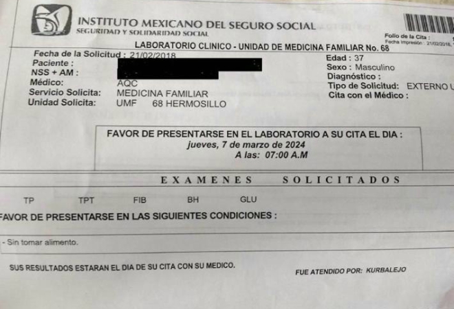 El servicio del IMSS se caracteriza por ser un tanto lento, pero vaya sorpresa que se llevó este hombre cuando el laboratorio clínico de la Unidad de Medicina Familiar número 68, de Hermosillo, Sonora, le dio cita a este paciente para el 7 de marzo del 2024.