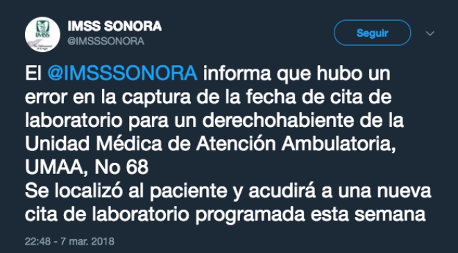 Tanto fue su ‘éxito’ de la publicación que hasta oídos del IMSS llegó y no tardaron en manifestarse, la cuenta de Twitter del IMSS-Sonora contestó que había cometido un error y daría una nueva cita en los próximos días.