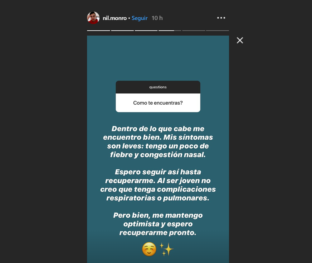 Nil asegura que tiene síntomas leves y está a la espera de ver cómo evoluciona en los siguientes días.