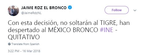 Luego de que fuentes del Instituto Nacional Electoral (INE) revelaran que los aspirantes independientes Jaime Rodríguez "El Bronco" y Armando Ríos Piter se quedarían por debajo de las firmas que necesitaban para aparecer en la boleta electoral debido a irregularidades, el exgobernador de Nuevo León estalló en Twitter: