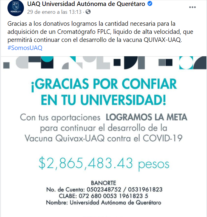 Debido a que la federación sólo les otorgó 2 millones de pesos para el proyecto, la UAQ ha recaudado recursos entre donaciones, subastas y venta de tapitas para continuar con el desarrollo de la vacuna QUIVAX-UAQ. Gracias al apoyo de los ciudadanos y empresas el pasado 29 de enero anunciaron que habían recaudado 2 millones 865 mil 483 pesos, que les permitirá iniciar con la fase 3 de los ensayos.