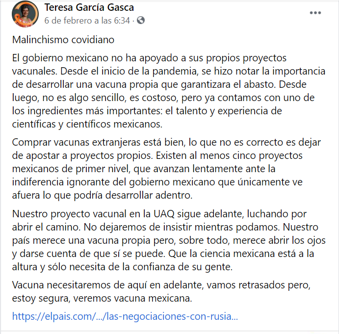 "Comprar vacunas extranjeras está bien, lo que no es correcto es dejar de apostar a proyectos propios. Existen al menos cinco proyectos mexicanos de primer nivel, que avanzan lentamente ante la indiferencia ignorante del gobierno mexicano", escribió la rectora en su cuenta de Facebook.La rectora señaló que desde el inicio de la pandemia se hizo notar la importancia de tener una vacuna propia para garantizar el abasto a la población. Además, aseguró que sí habrá una vacuna mexicana, y aunque el proyecto de la UAQ va retrasado, no dejarán de insistir hasta lograrlo.