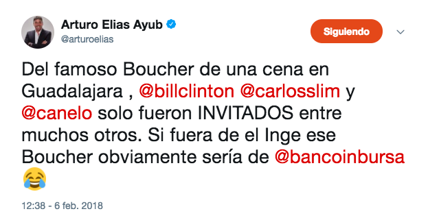 https://twitter.com/arturoelias/status/960975950379933696 "Del famoso Boucher de una cena en Guadalajara , @billclinton @carlosslim y @canelo solo fueron INVITADOS entre muchos otros. Si fuera de el Inge ese Boucher obviamente sería de @bancoinbursa", tuiteó Ayub.