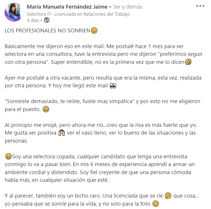 Manuela Fernández, una profesionista de Buenos Aires, compartió en su perfil de LinkedIn que fue rechazada de un empleo por ser muy simpática, a pesar de cumplir con el perfil que buscaba la empresa.