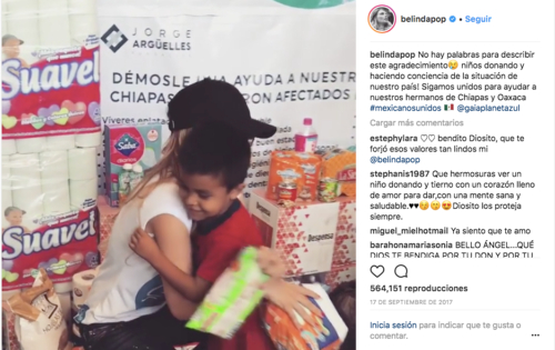 Cuando sucedió el sismo del 19 de septiembre, Belinda se mantuvo muy activa ayudando a distintas comunidades, en especial a los damnificados de Morelos, pues se filtró un supuesto video en el que estaba ayudando a gente del PRI con miras a las elecciones del 1 de julio para obtener votos.