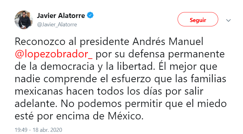 Tras difundirse el video, Alatorre se volvió tendencia en redes sociales donde recibió decenas de críticas; a lo que el conductor respondió: "no podemos permitir que el miedo se apodere de México".Ya no haga caso a Javier Alatorre. Esta noche alcanzó el nivel más deplorable del golpismo mediático. Y ha puesto en riesgo la vida de miles de mexicanos, intentando desvirtuar y desacreditar al Doctor Hugo Gatell. Es urgente que la @SEGOB_mx intervenga. pic.twitter.com/qr30yw1E4E