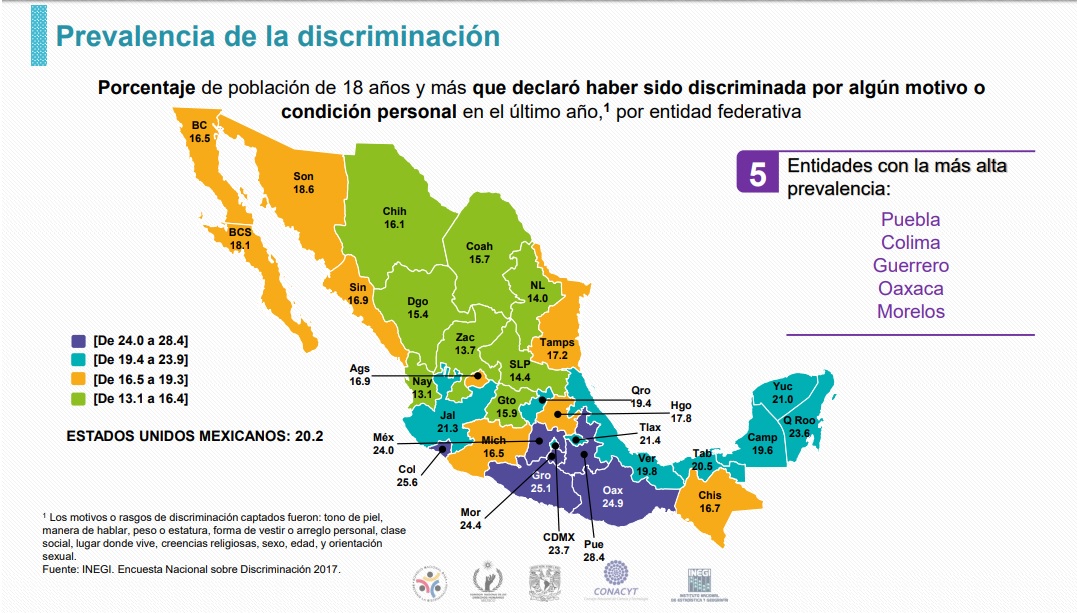 Según las respuestas de los encuestados, donde más se discrimina es en la zona centro-sur del país: Puebla va a la cabeza con el 28.4% de prevalencia, le sigue Colima (25.6%), Guerrero (25%), Oaxaca (24.9%) y Morelos (24.4%).