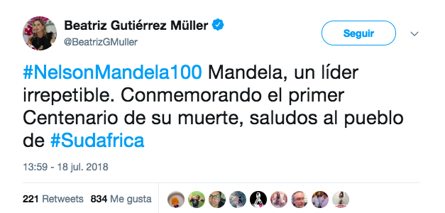 Sin embargo, la esposa del presidente electo de México cometió una equivocación a la hora de redactar y en vez de escribir el "centenario del nacimiento" de Mandela, escribió el "centenario de su muerte".