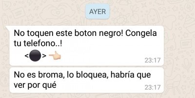 Se trata de un breve mensaje que advierte que tu teléfono se quedará congelado con la leyenda: "¡No toquen este botón negro!" y lo que parece ser un emoji de punto negro.