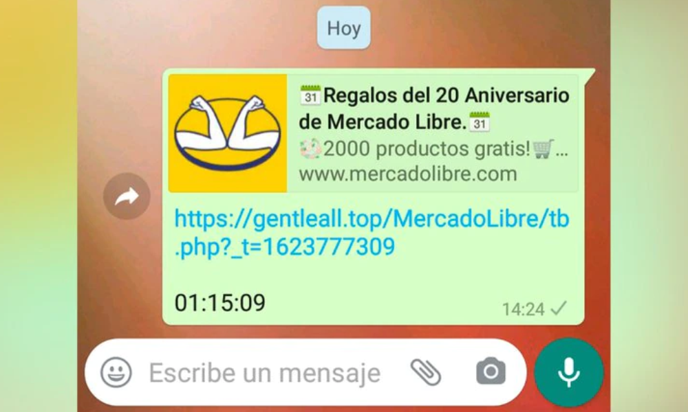En el mensaje que circula, los estafadores prometen 2 mil regalos para celebrar el supuesto 20 aniversario de Mercado Libre y para participar en el sorteo te piden registrarte en un link. Sin embargo, este tipo de estafa cibernética es conocida como 'phishing', que utilizan los ciberdelincuentes para obtener información confidencial de los usuarios y luego suplantar su identidad.El sorteo que está circulando por WhatsApp por el aniversario de nuestra compañía es falso. Se trata de un caso de publicidad engañosa y nuestro equipo especializado ya avanzó con la denuncia.