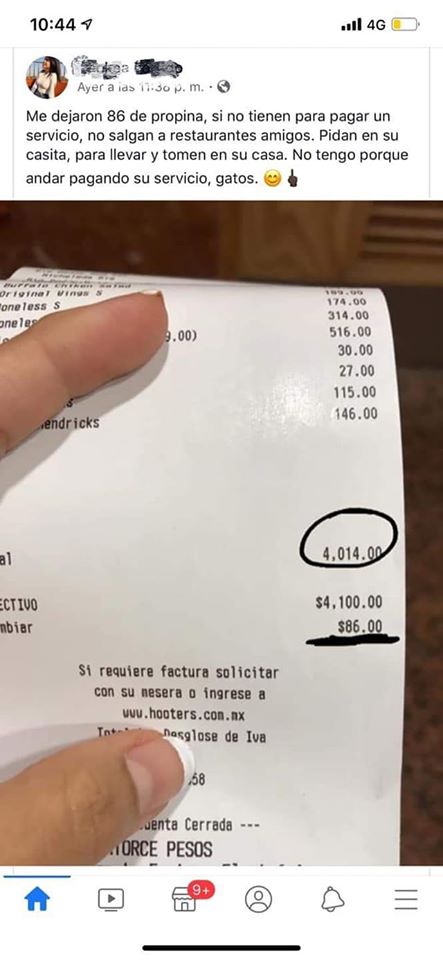 "Me dejaron 86 de propina, si no tienen para pagar un servicio, no salgan a restaurantes amigos. Pidan en su casita, para llevar y tomen en casa. No tengo porque andar pagando su servicio, gatos", escribió la mesera.