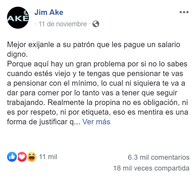 El comentario se viralizó gracias al usuario Jim Ake, quien difundió una captura en su página de Facebook y le recomendó mejor exigir que le pagaron un salario justo.